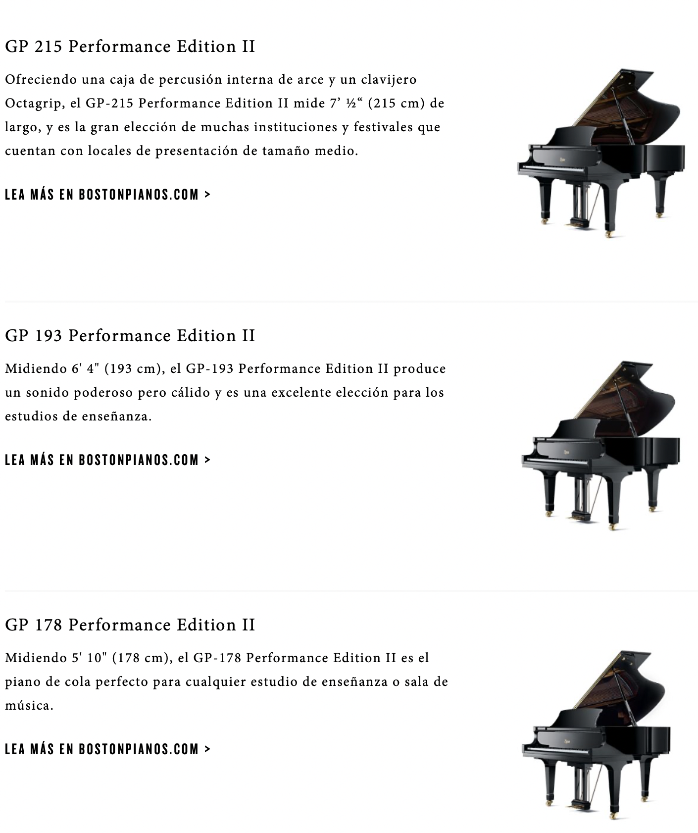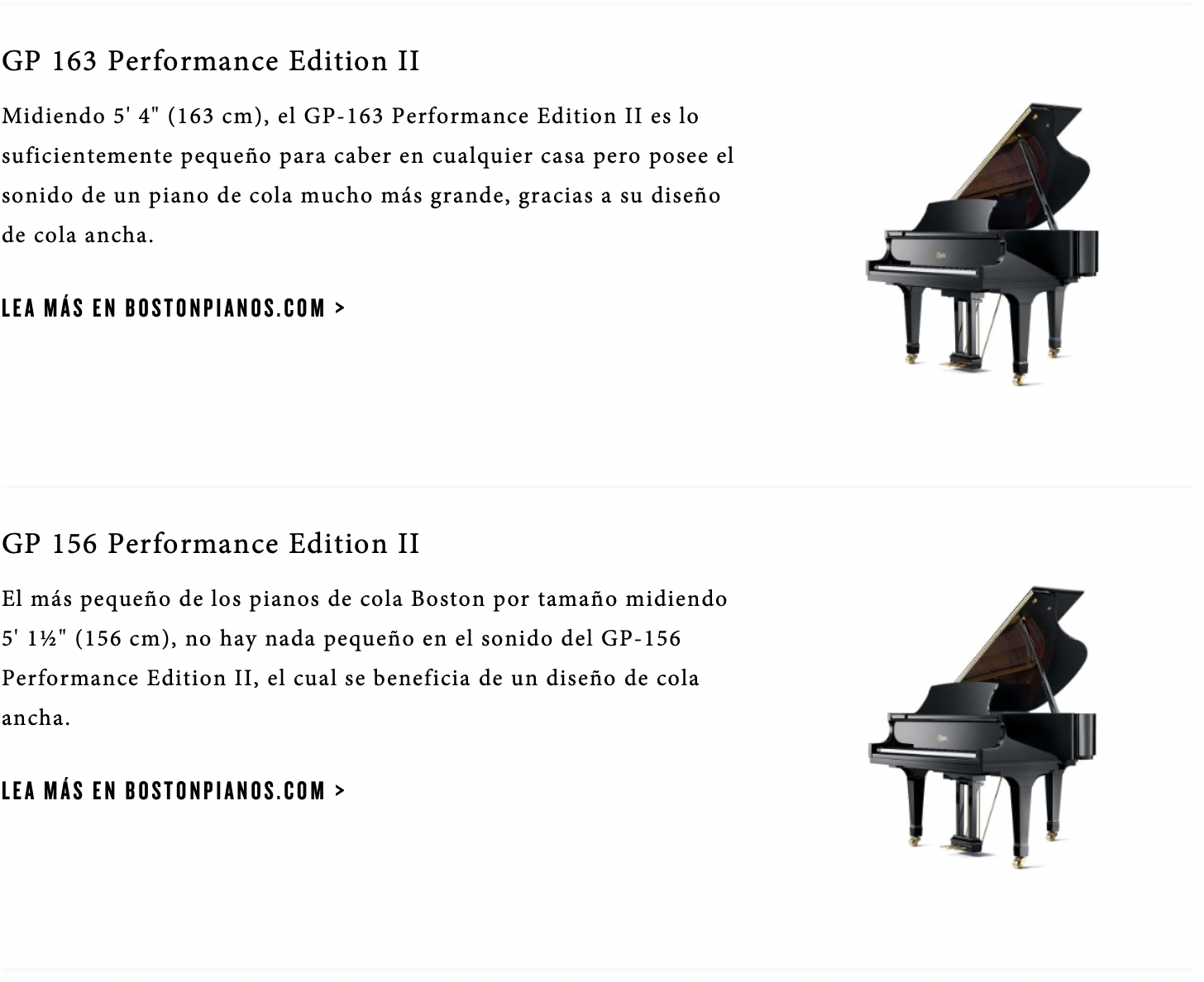 Pianofortes negros con tapa abierta y patas doradas, centralmente colocados en una página web con texto en español, descripción de pianos de cola Boston Performance Edition II.