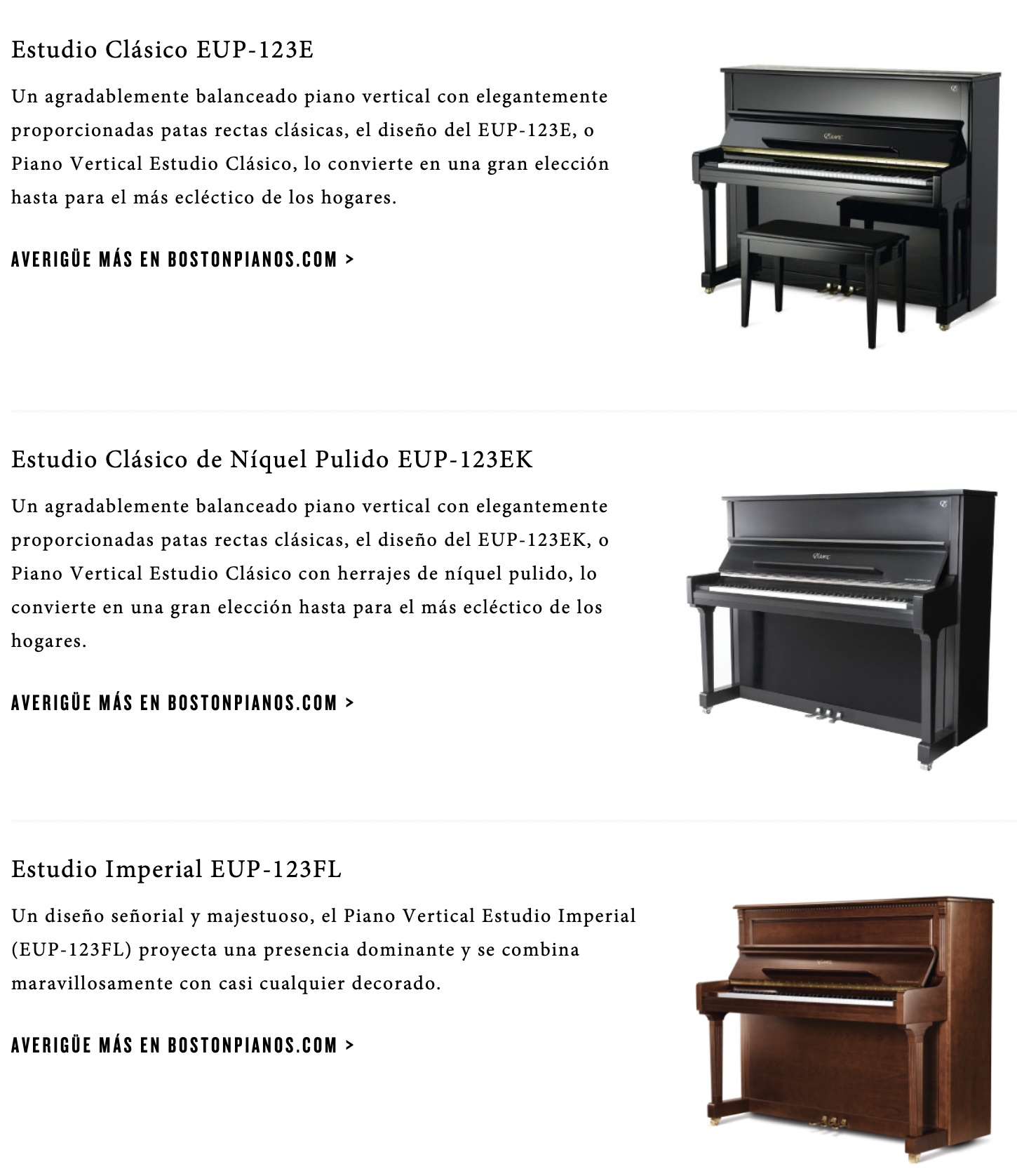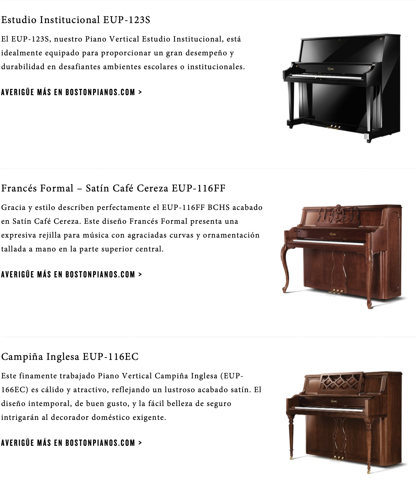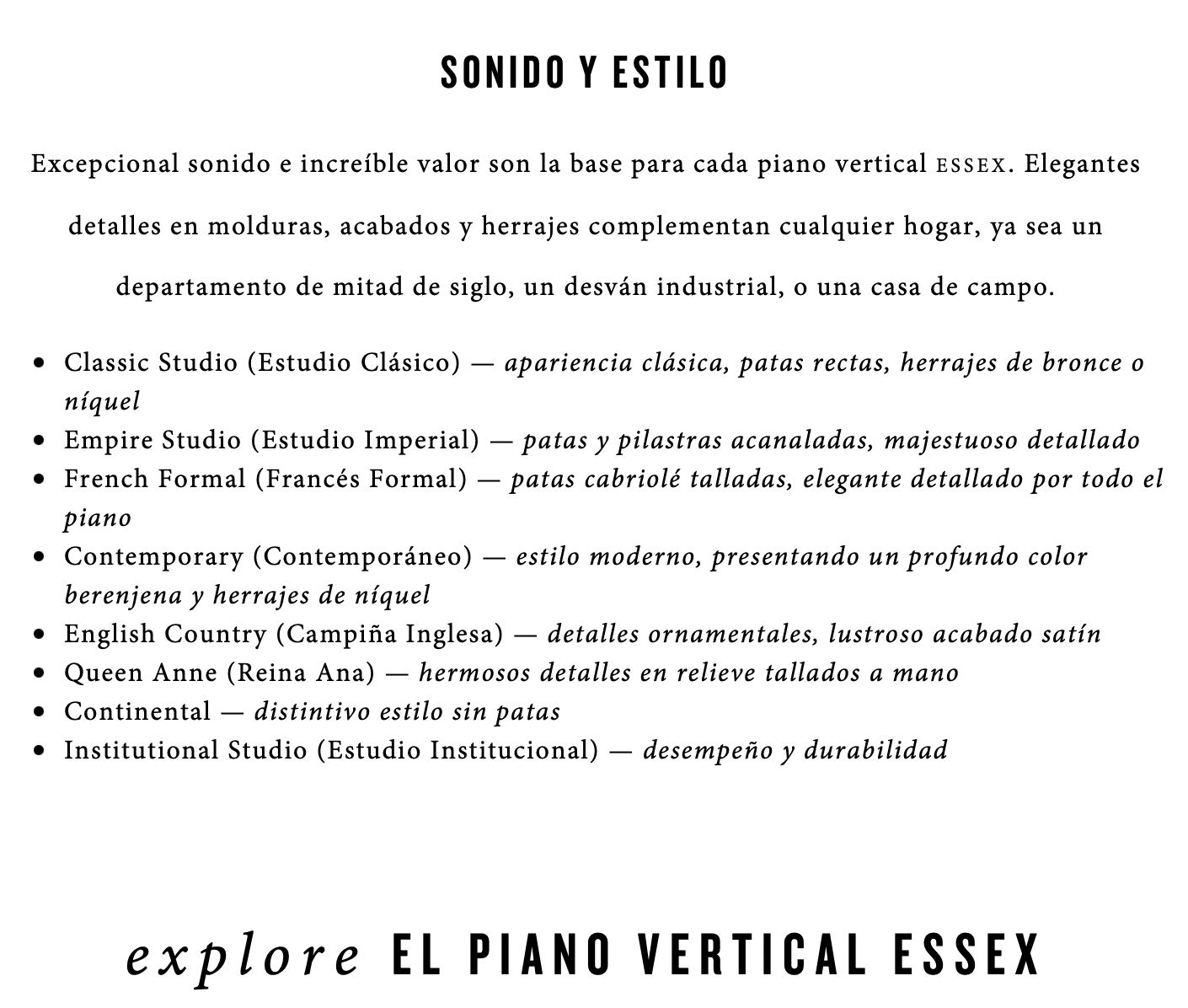 Texto en una página que describe diferentes estilos de pianos verticales ESSEX, incluyendo clásicos, industriales, formales, contemporáneos, campestres, de reina y de estilo sin patas, con detalles en madera y herrajes, y prescriptions sobre sus características y estilos.