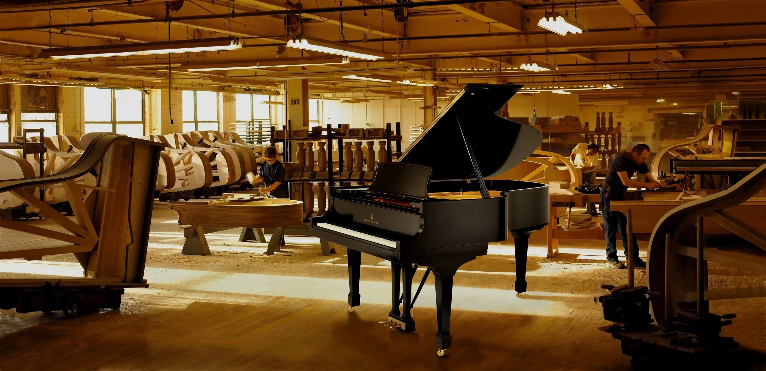 Texto en fondo negro que dice "El piano de cola de salón más pequeño, legendario y polifáctico".