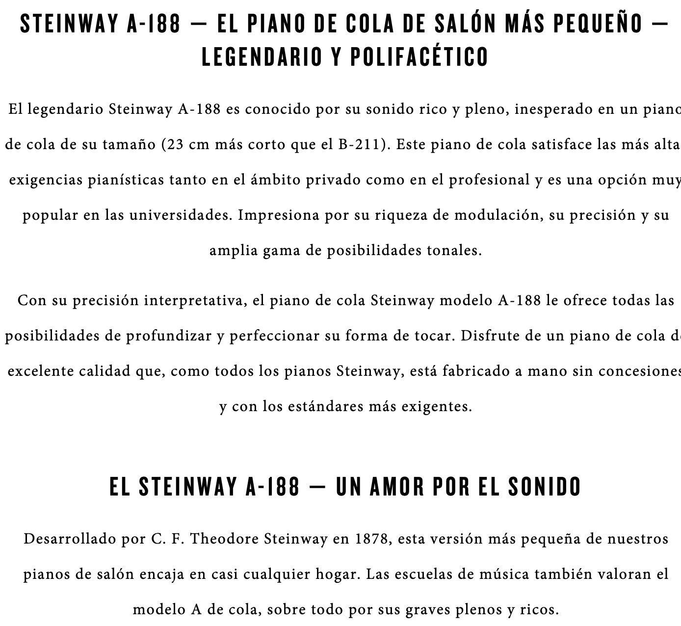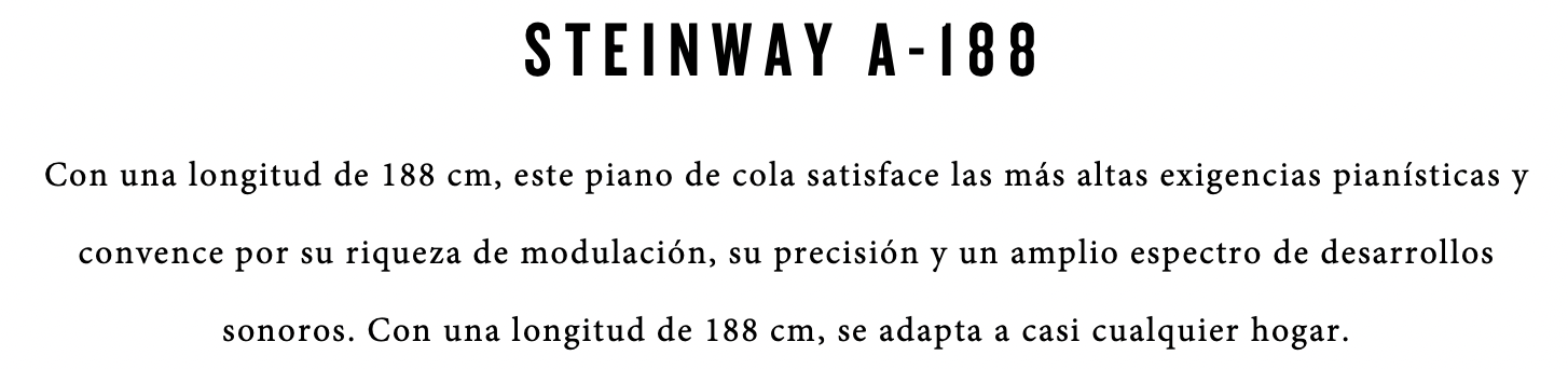 Descripción del texto: Título 'STEINWAY A-188' y párrafo sobre un piano con esa longitud, sus características y ventajas.