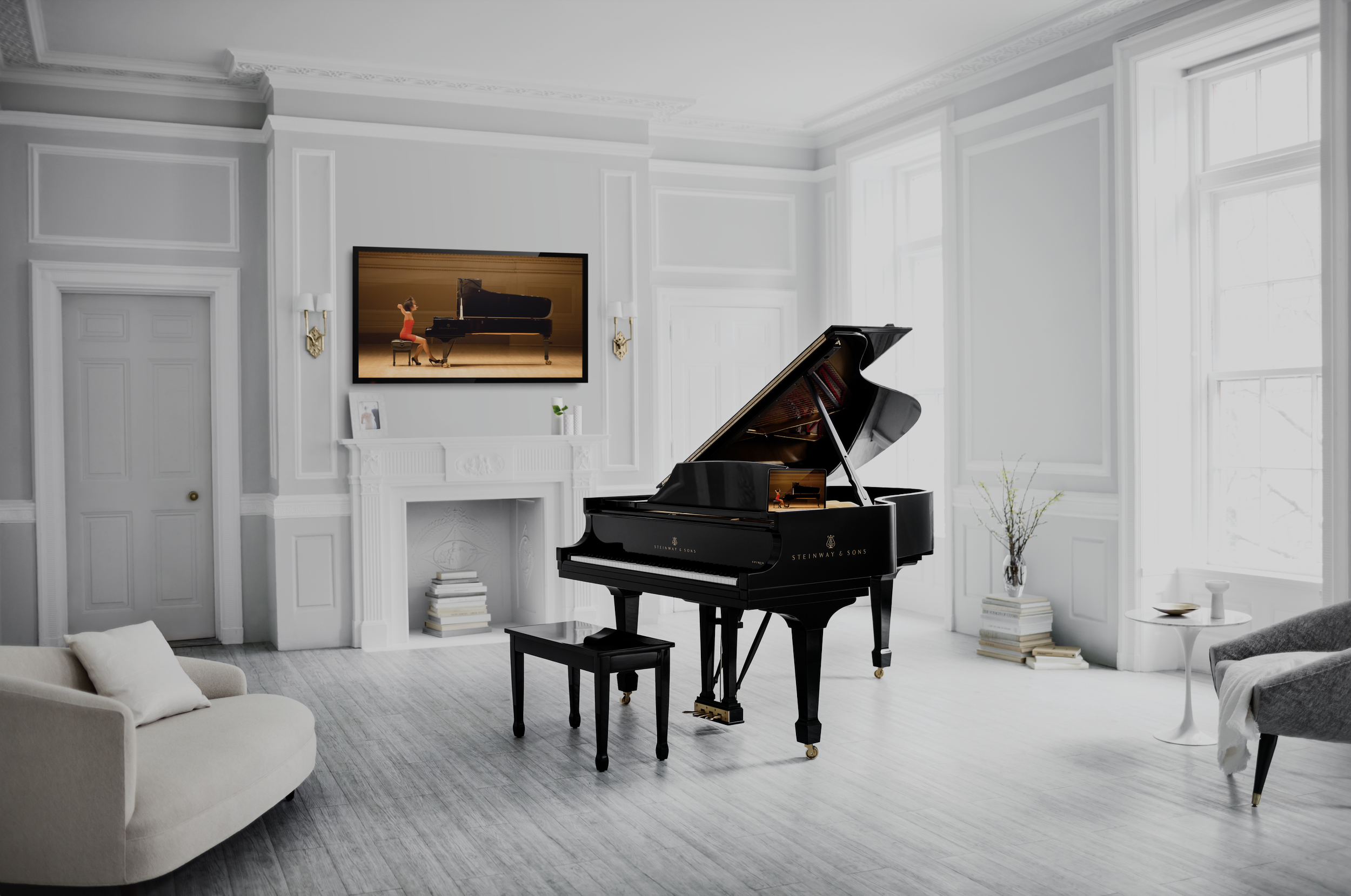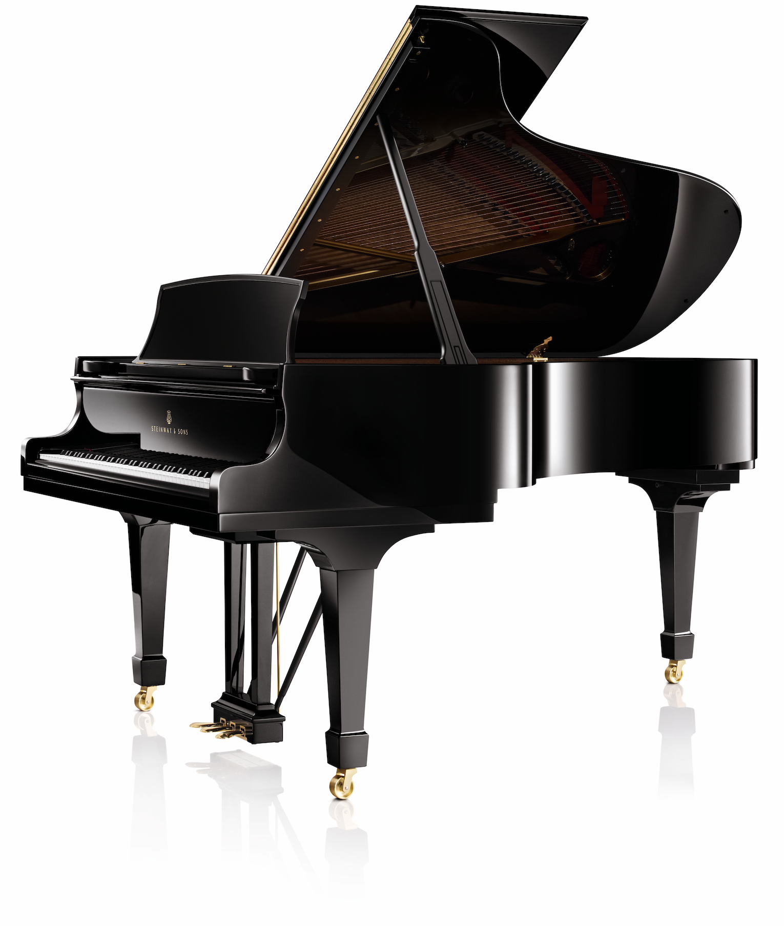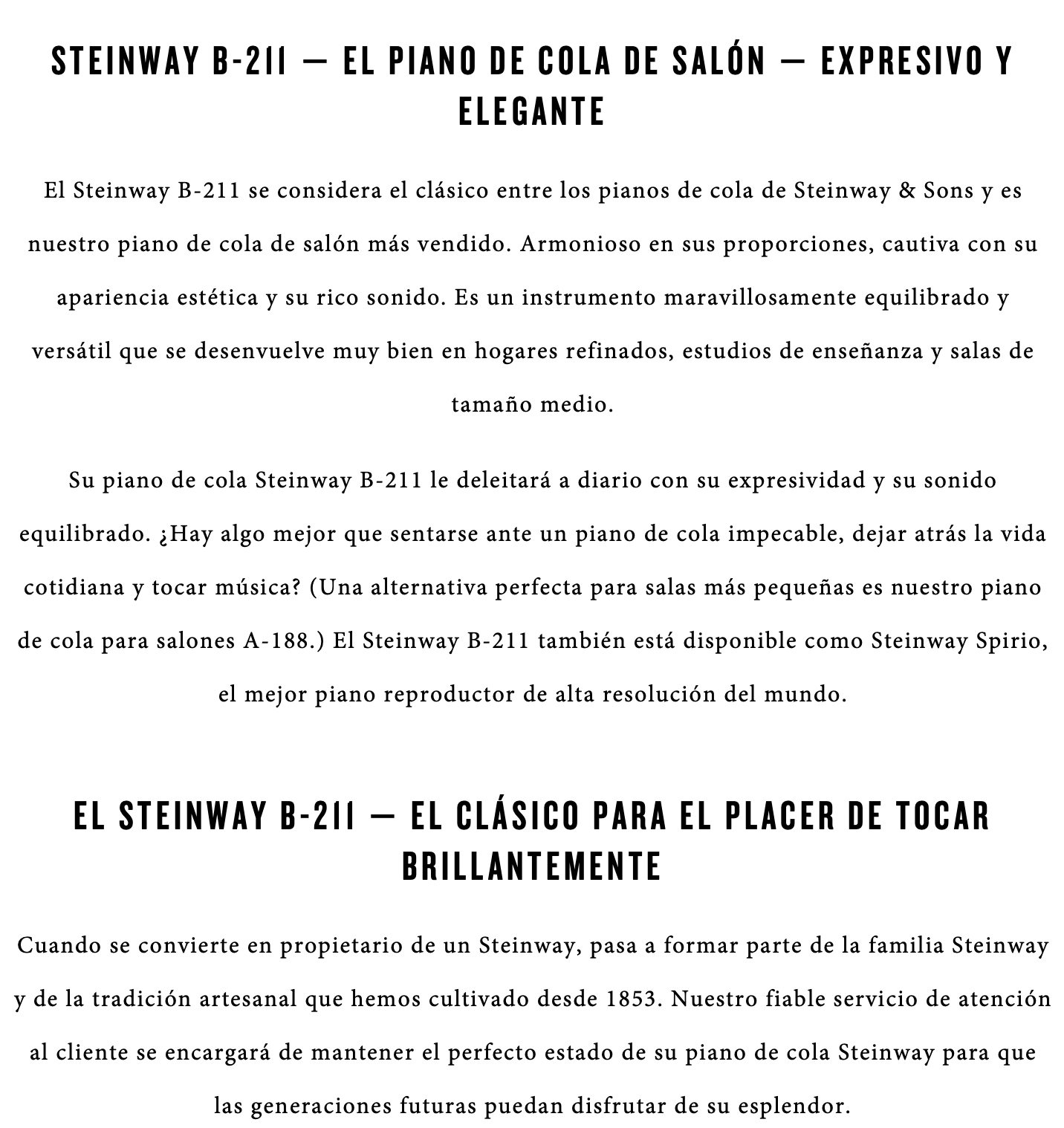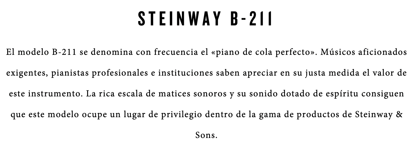 Texto en una página que describe el piano Steinway B-211, destacando su calidad, sonido, versatilidad y disponibilidad como Steinway Spirio, y además habla sobre la historia y tradición de la familia Steinway en la fabricación de pianos desde 1853.