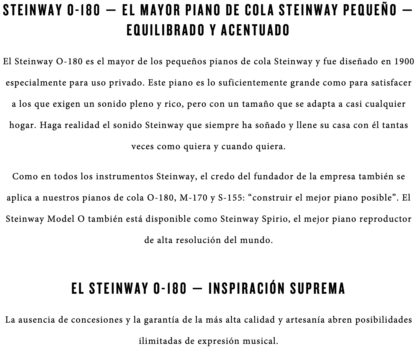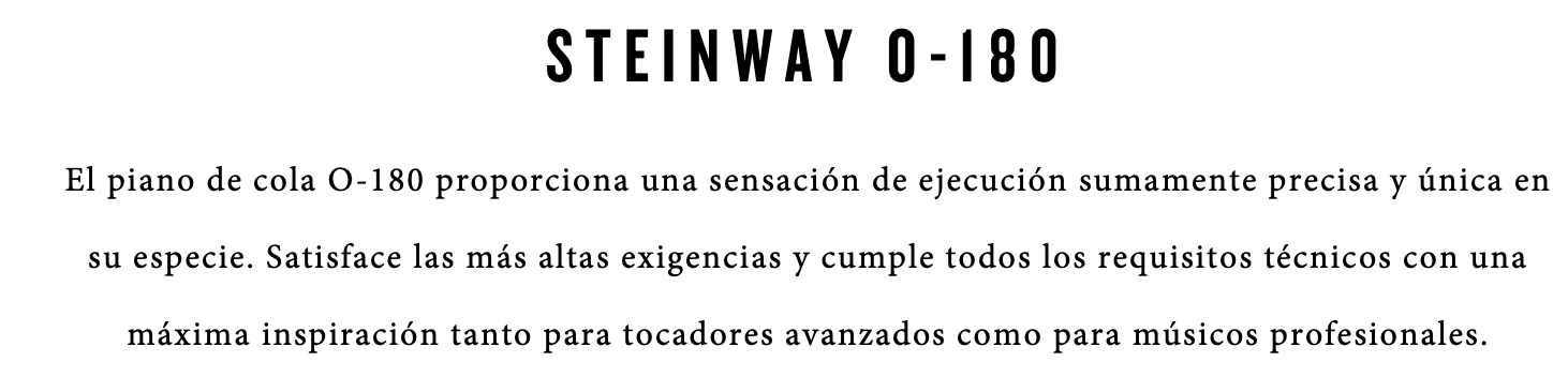 Texto explicativo sobre el piano Steinway O-180, destacando su tamaño, historia, calidad y disponibilidad de diferentes modelos, incluyendo el Steinway Spirio. También menciona la inspiración que representa y la calidad y artesanía de la marca.