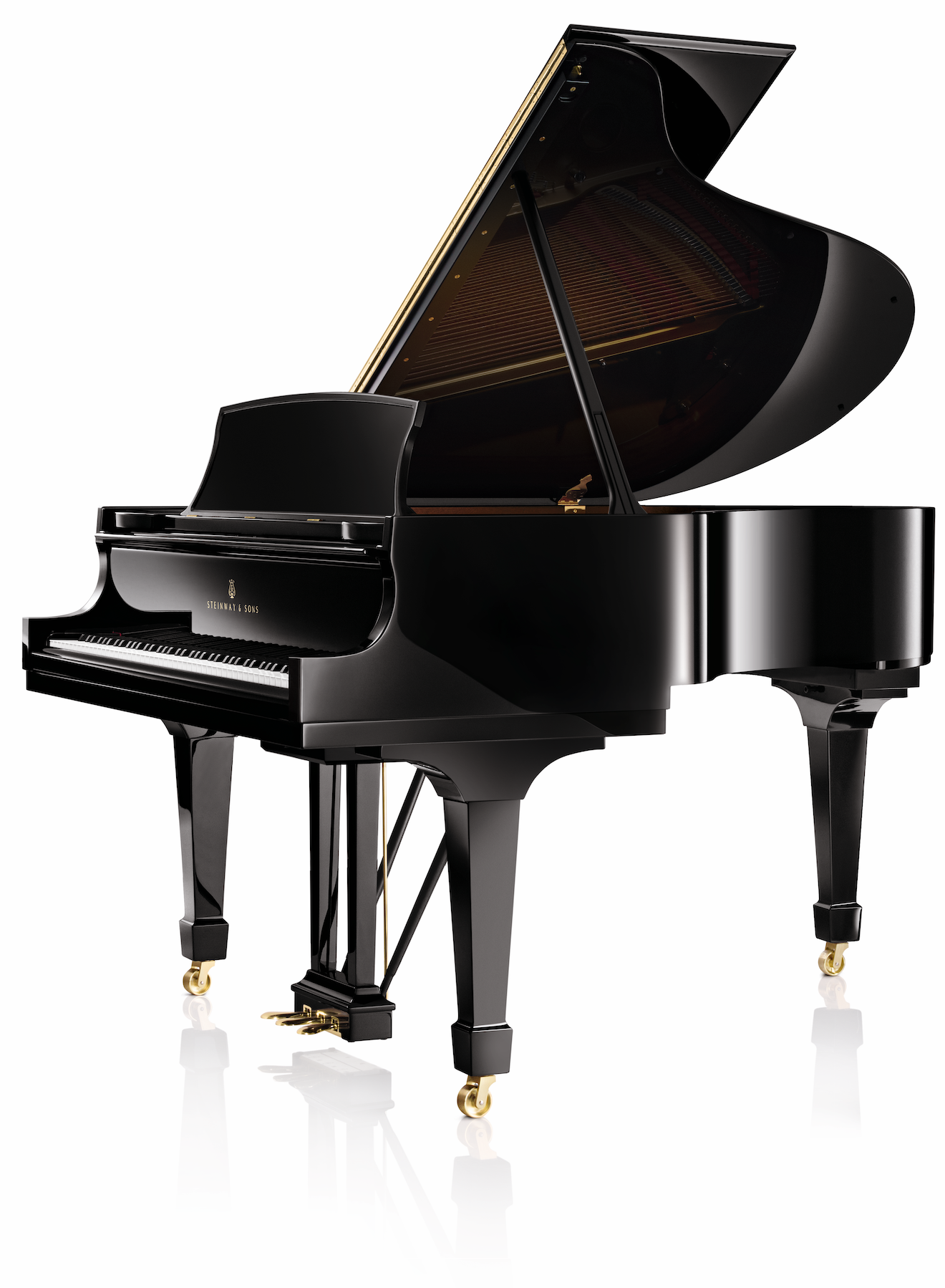 Texto en un fondo negro que dice: 'El mayor piano de cola Steinway pequeño, equilibrado y achatado'.
